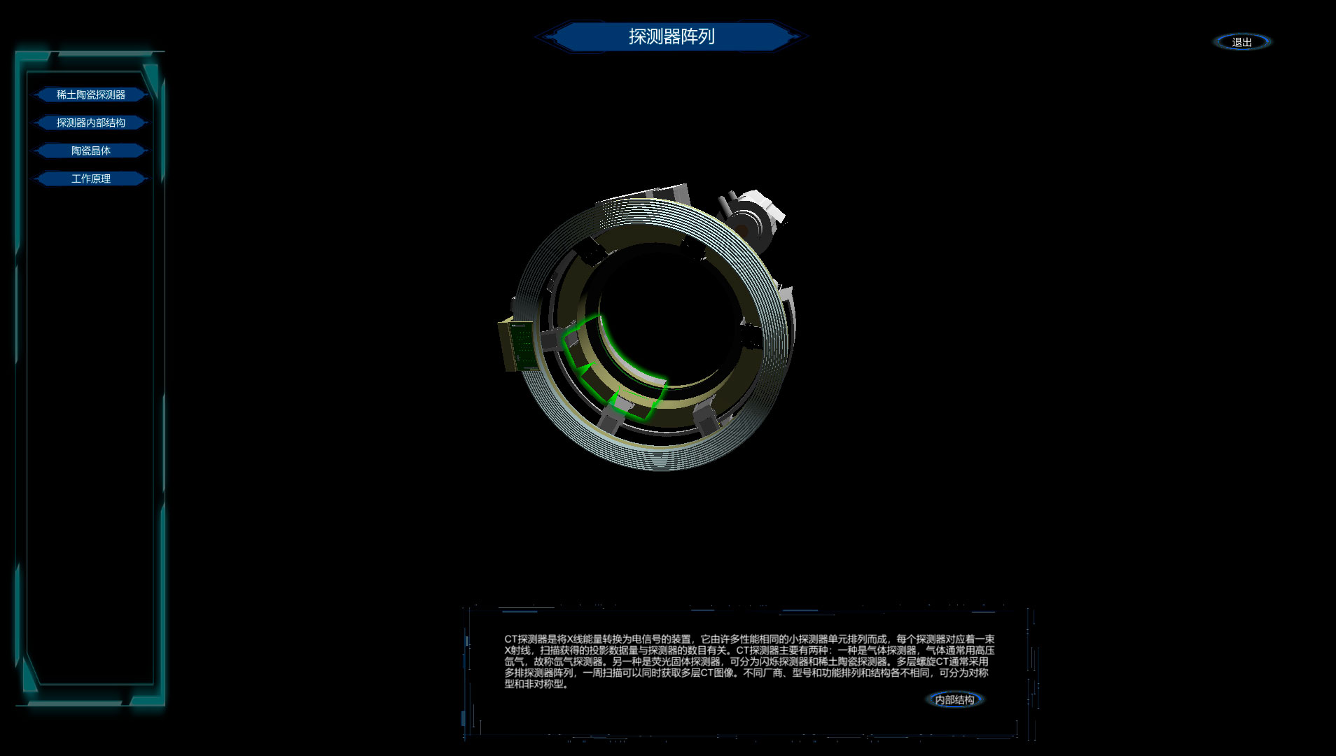 可对CT DR MRI设备的3D模型进行拆解,组装,并演示工作原理。同时可以对学生进行考核。 支持部件的旋转,放大,缩小,移动。可在任意角度对目标部件进行定位观察。并对各个零部件配有知识点文字或视频说明。支持设备按拆解顺序操作。拆解机壳和真实CT机拆解顺序一致。